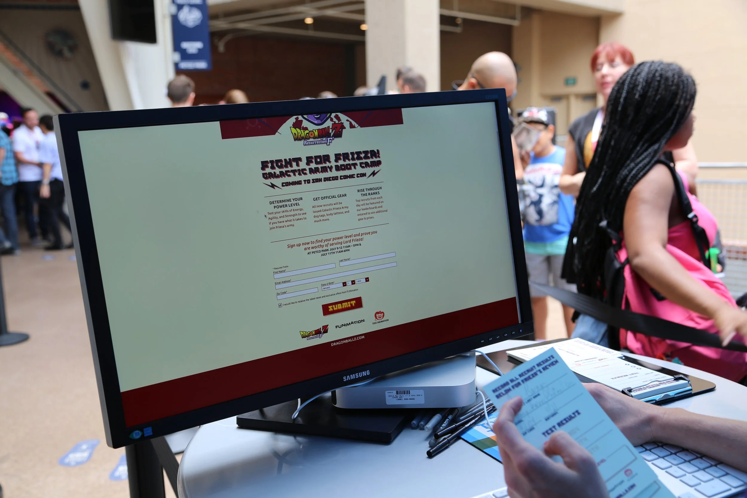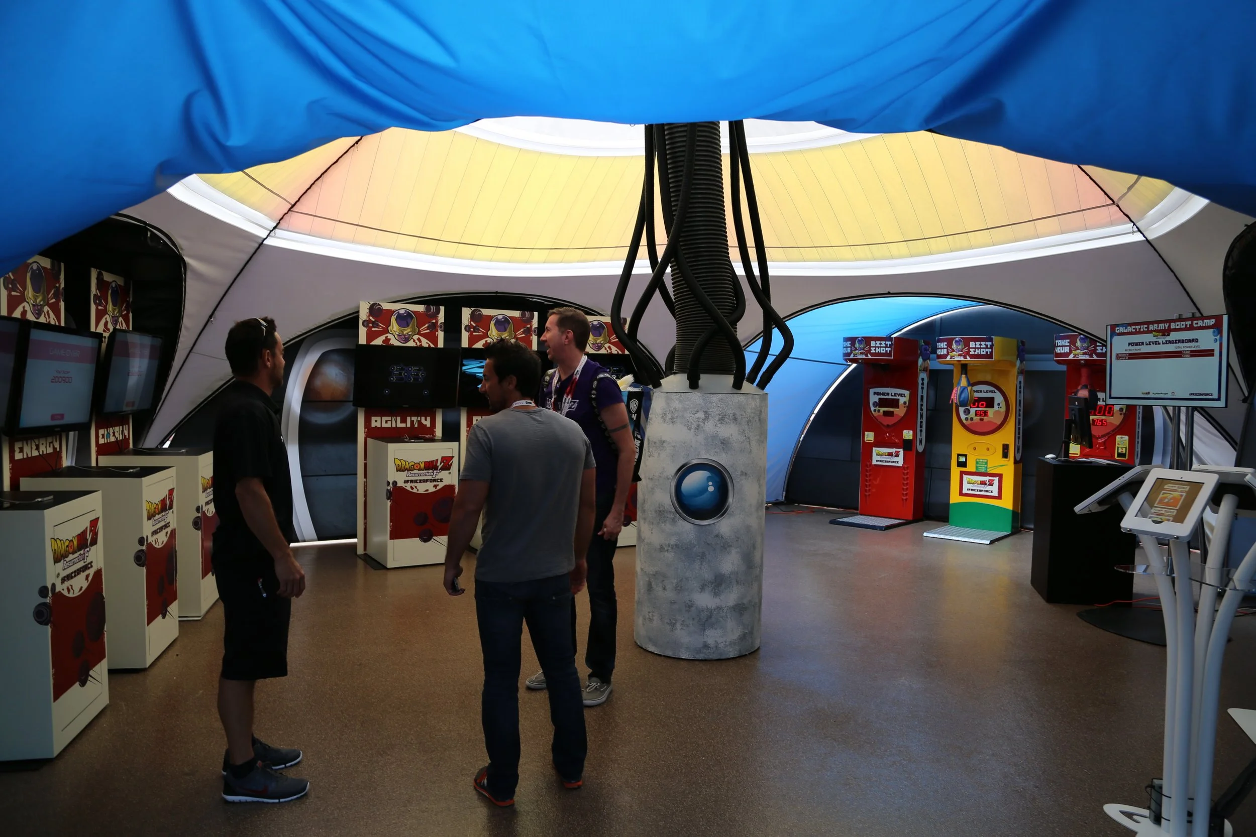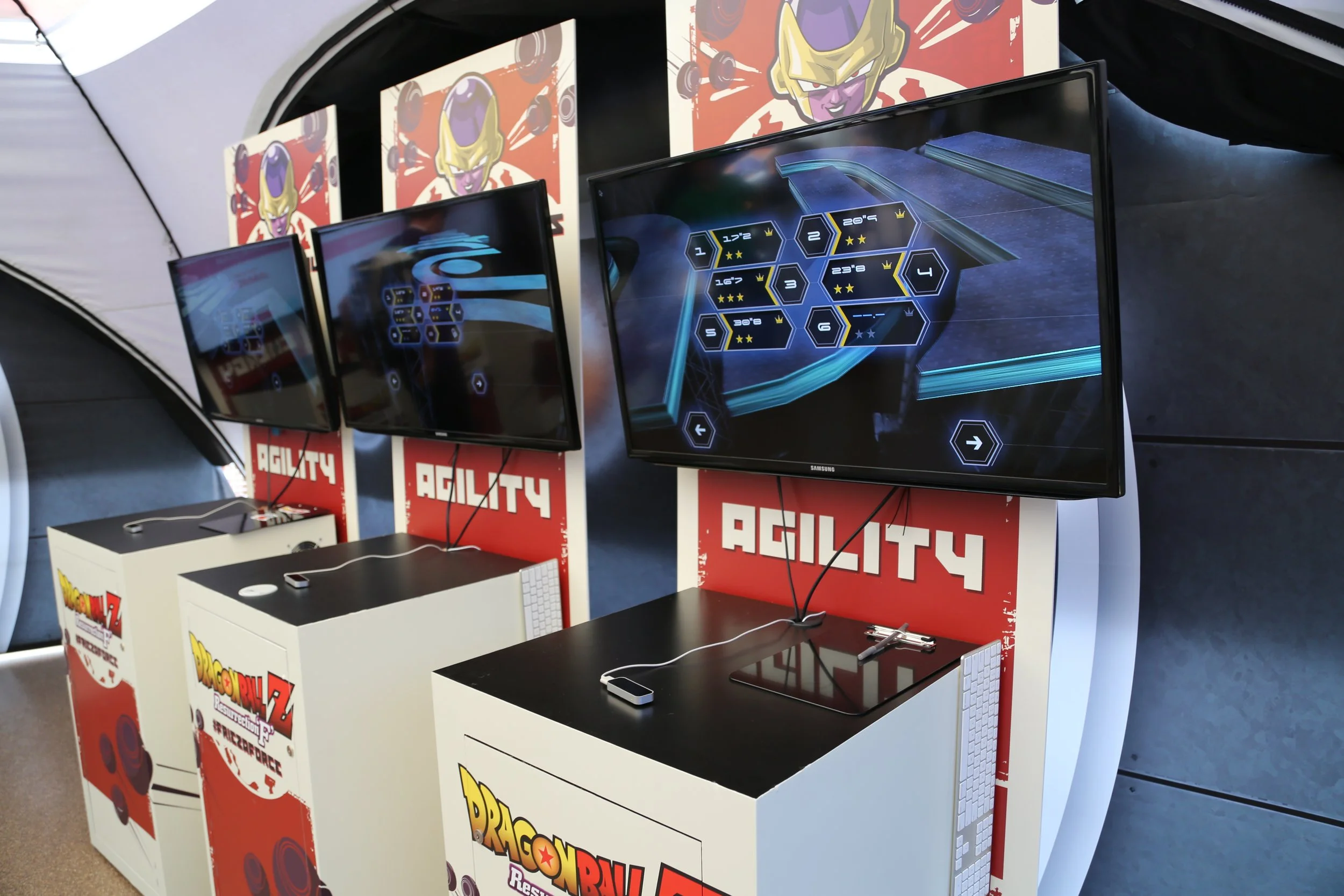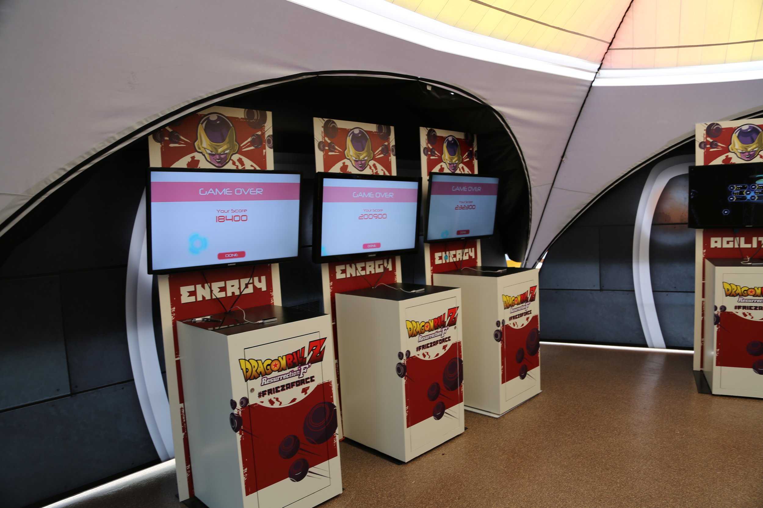 At Petco park in San Diego, to promote the Funimation feature film “DRAGONBALL Z Resurrection F” we created a popup installation with a variety of games to judge your capabilities to join the FRIEZA FORCE. Attendees register at a kiosk and they can compete against other attendees to determine strength, agility and intelligence. Each station was branded and the scores were registered and uploaded to a leaderboard.